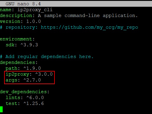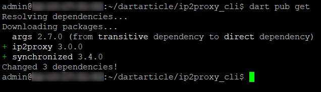 Check for the latest version of the IP2Proxy Dart package at https://pub.dev/packages/ip2proxy/install and modify the code below for that version. We are also using the args package for specifying the command line parameters.